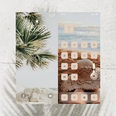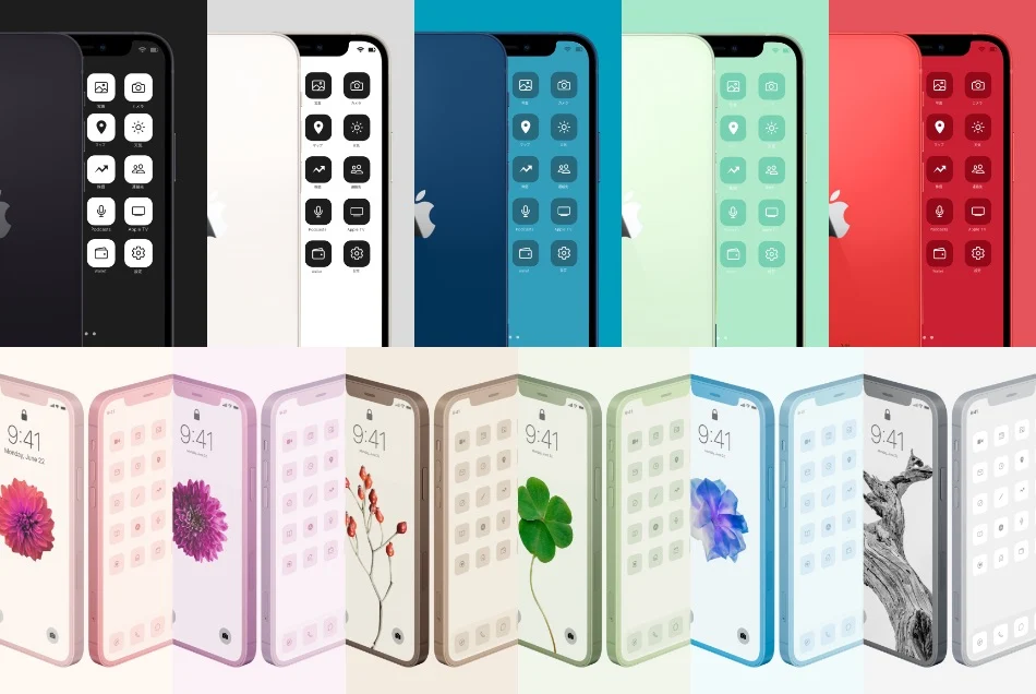 純正アプリから人気アプリまで対応したアイコン素材350コに加え、ホーム画面やロック画面を彩るオリジナルの壁紙も付いてくる。