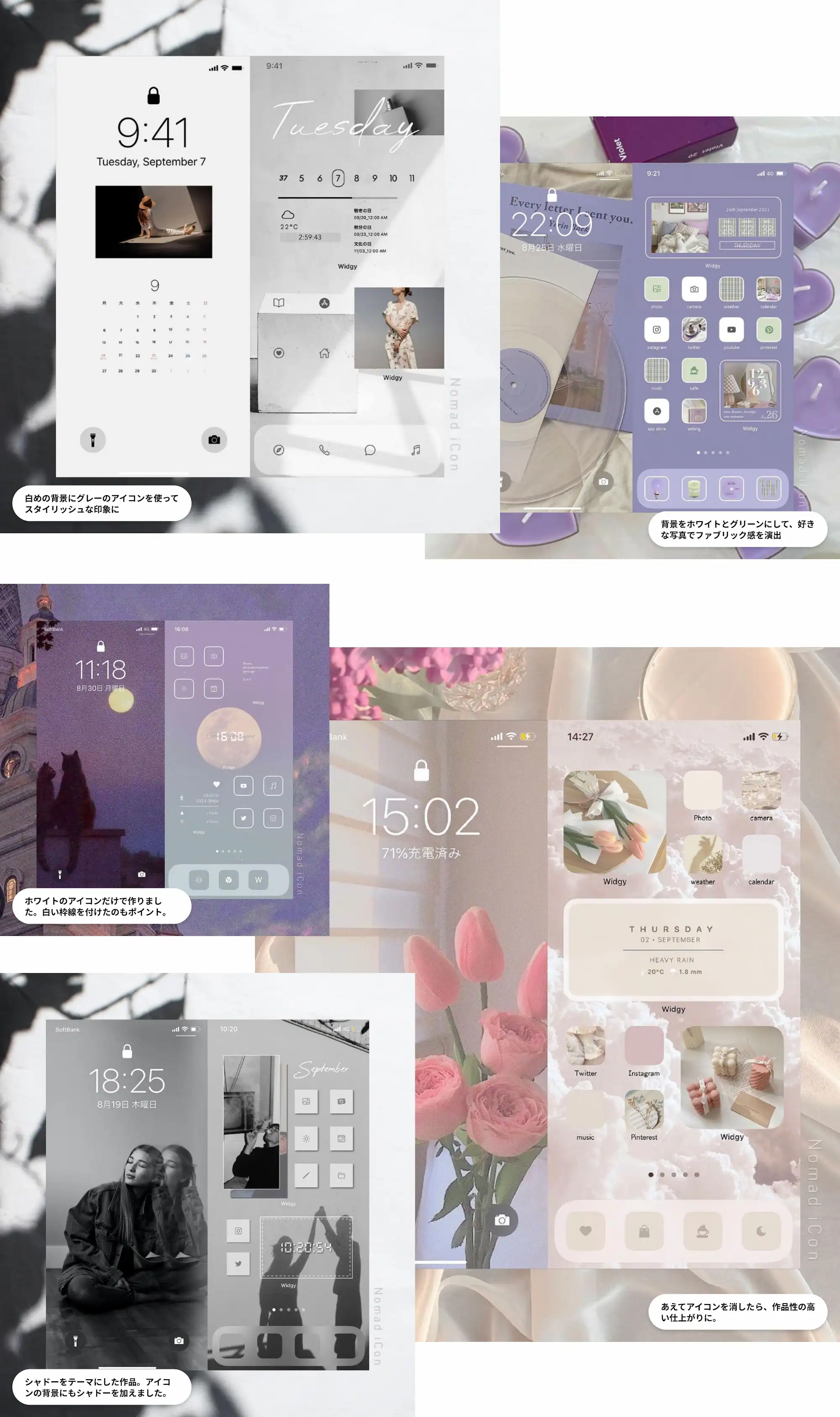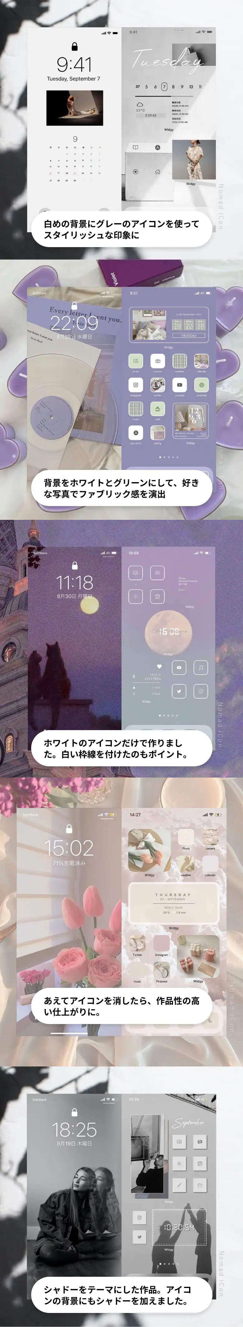 アイコンの背景が透明だから、壁紙が透けてスタイリッシュな仕上がりに。